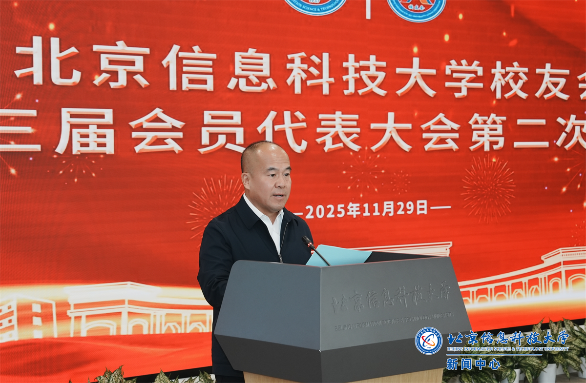 郭福在致辞中代表学校向与会校友代表表示热烈欢迎,对广大校友长期以来关心支持母校发展表示衷心感谢。他指出,校友是母校最宝贵的财富,是母校事业发展最坚实的依靠,更是母校精神最鲜活的载体。自第三届会员代表大会第一次会议以来,校友会始终围绕“服务校友、服务母校、服务社会”的宗旨,持续完善组织建设、深化情感联络、促进资源共享,推动校友与母校之间形成紧密互动、协同发展的良好局面。他强调,近年来,学校按照“外树形象、内聚力量、服务师生、加快发展”总体思路,紧紧围绕内涵建设与高质量发展,取得了一系列令人振奋的办学成果,这些成绩的取得,离不开广大校友的倾情关注与鼎力支持。面向未来,郭福对校友会工作提出三点希望:一是深耕精神传承,筑牢情感根基,持续完善校友网络,创新服务机制,让校友会成为所有“信息科大人”心中最温暖的精神家园;二是聚焦协同融合,激活发展动能,搭建母校、校友与行业之间的联动平台,推动双向赋能、共同发展;三是强化自身建设,提升服务质效,完善组织架构,规范运行机制,以更高水平的专业服务回应校友期盼,助力校友成长。