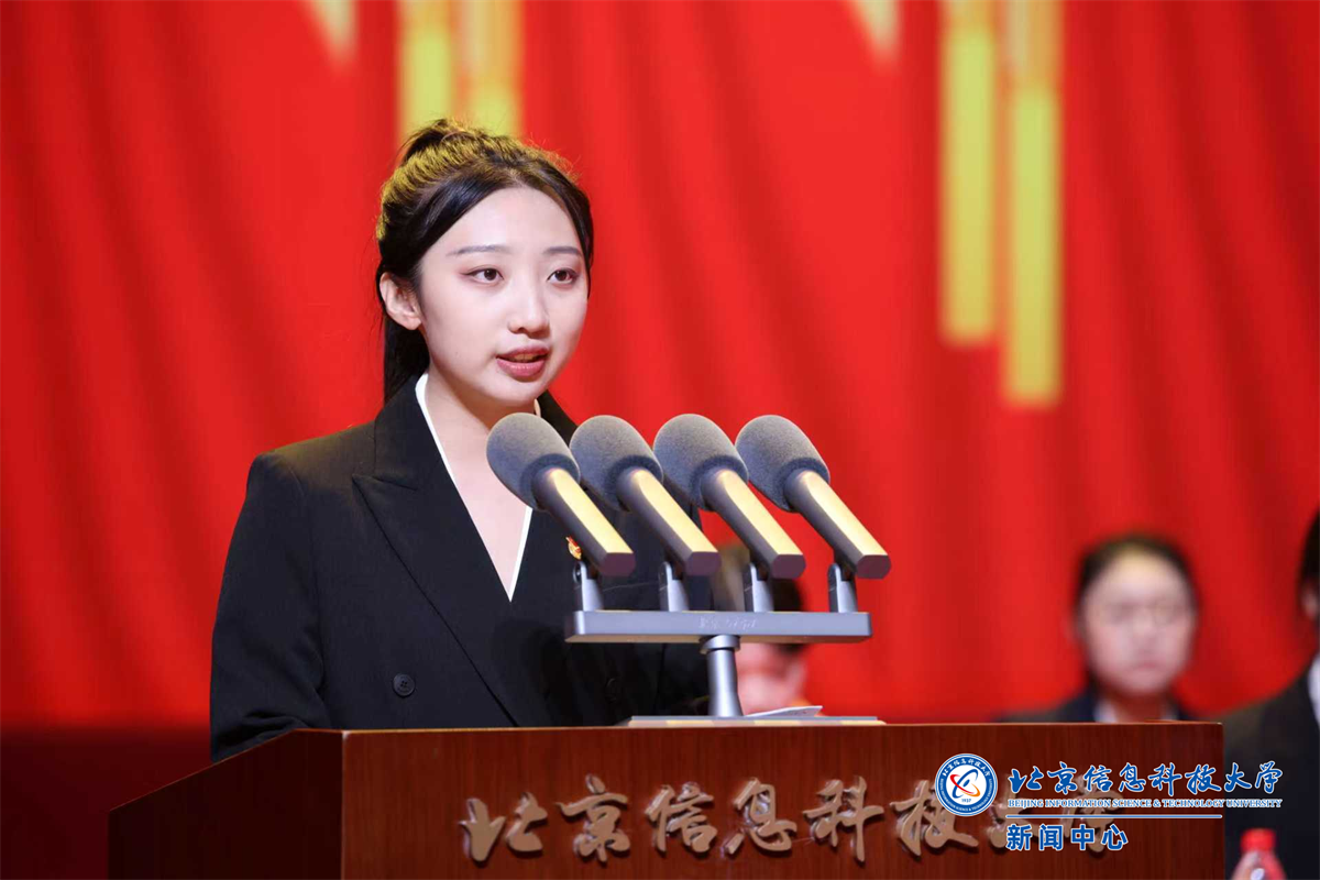 校学生会执行主席张渊雅代表北京信息科技大学第七届学生会作题为《铭记历史初心,赓续精神力量,践行青春誓言,共推复兴伟业》的工作报告。