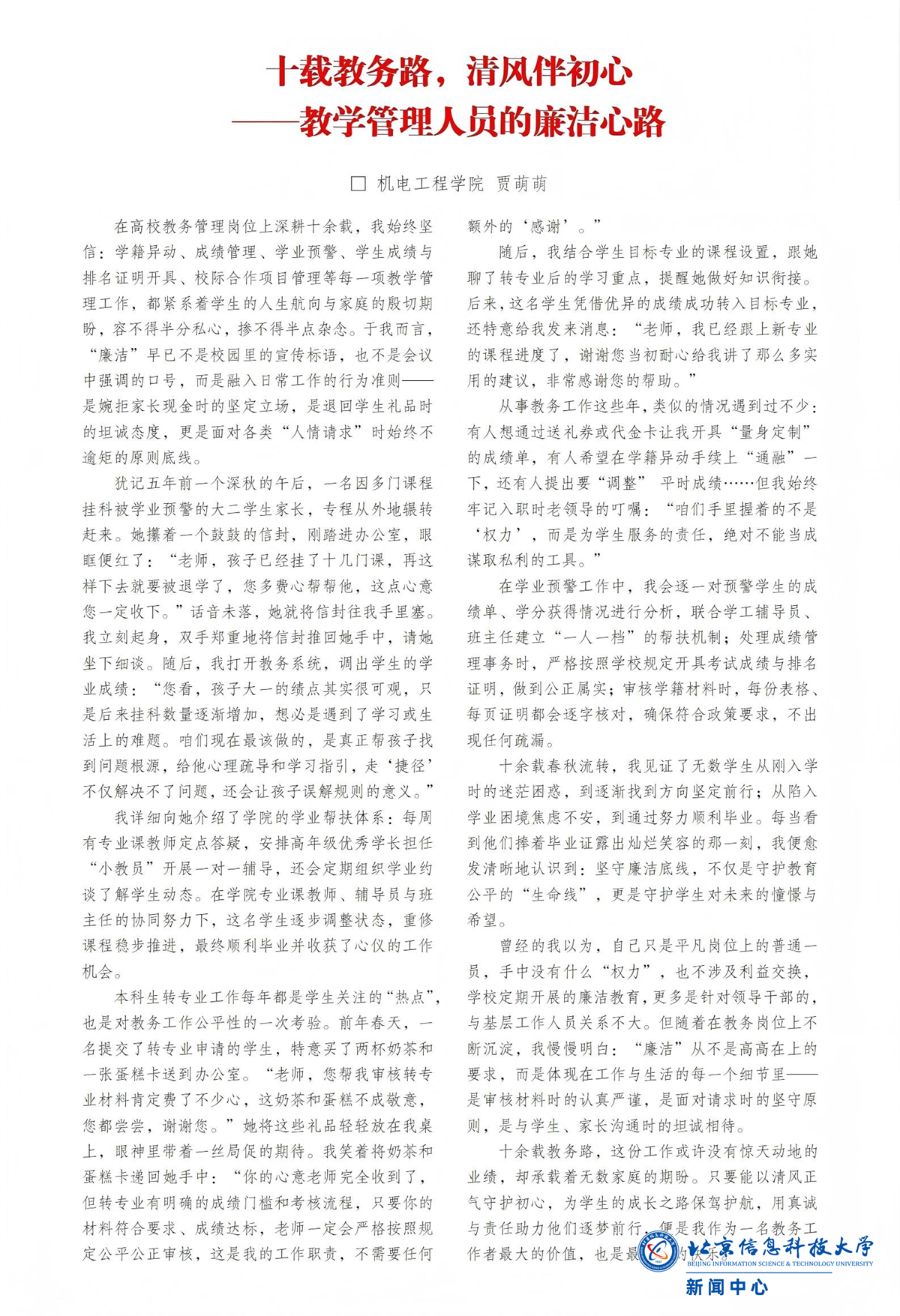 机电学院党委报送的《十载教务路,清风伴初心》获廉洁故事精品奖。作者从在高校教务管理岗位上深耕十余载的教师视角,深刻阐释“廉洁”是融入日常工作的行为准则;计算机学院党委报送的《“廉”环扣:守护你的大学时光与未来之路》聚焦大学场景,以案例切入,引导同学们辨析廉洁价值,获廉洁主题微课优秀奖。