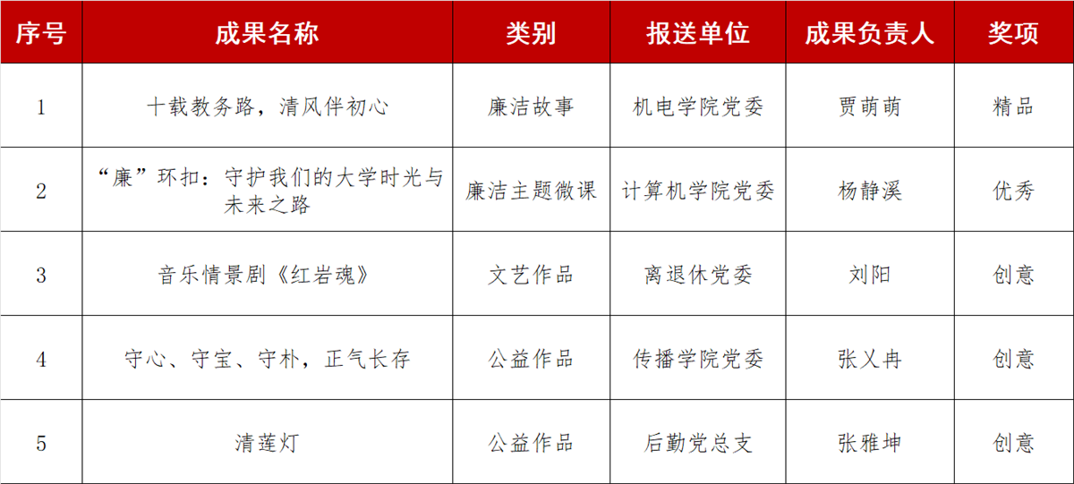 我校选送的5件廉洁文化建设成果获奖,其中精品成果1件、优秀成果1件、创意成果3件,创历年最好成绩,充分彰显了学校廉洁文化建设的扎实成效与创新特色,是学校持续推进廉洁文化建设、深化“三全育人”综合改革的积极成效,也体现了师生共同投身校园廉洁文化建设的主动性与创造性。